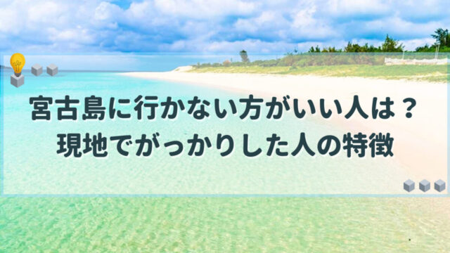 生活関連 宮古島に行かない方がいい人は?現地でがっかりした人の特徴 宮古島での旅行は「やることないのでつまらなかった」との声があったり、近年はガラ悪い業者がいてがっかりしたり観光客もいます。宮古島に行かない方がいい人やつまらないと感じる理由、行った方がいい場所も紹介します。 生活関連