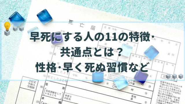 生活関連 早死にする人の11の特徴・共通点とは?性格・早く死ぬ習慣など 早死にする人の共通点は、性格傾向や早く死ぬ習慣などの意外な特徴もあります。「亭主を早死にさせる10箇条」の早死にする法則は有名ですね。この記事では、習慣や性格まで早死にする人の11の特徴について紹介します。 生活関連
