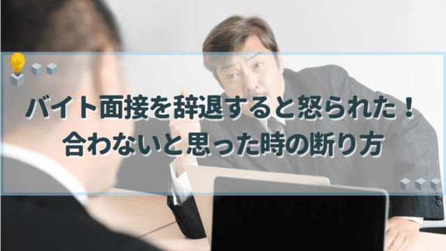 生活関連 バイト面接を辞退すると怒られた!合わないと思った時の断り方 バイト面接を辞退して怒られた経験を持つ人はいますが、応募者がよほど悪質でない限り損害賠償を請求される心配はありません。しかし連絡のタイミングや態度次第では説教される場合もあるので、怖い思いをしないために怒られる理由や断り方を解説します。 生活関連