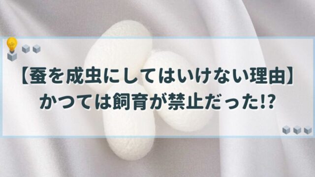 生活関連 【蚕を成虫にしてはいけない理由】かつては飼育が禁止だった!? 蚕を成虫にしてはいけない理由は、かつて養蚕が国の経済基盤であった時代の名残と口がないからかわいそうと言われる成虫の生態によるものと考えられます。人間が作った家畜である蚕の飼育が法律で禁止された背景を探ってみましょう。 生活関連