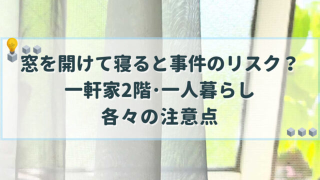生活関連 窓を開けて寝ると事件のリスク?一軒家2階・一人暮らし各々の注意点 窓を開けて寝ると、一軒家の2階や共同住宅の高層階でも怖い事件に巻き込まれるリスクは高くなります。とくに一人暮らしの女性は窓を開けたまま寝るのは絶対に避け、窓やドアにも防犯対策をすることが大切です。 生活関連