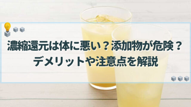 料理・食材 濃縮還元は体に悪い?添加物が危険?デメリットや注意点を解説 濃縮還元ジュースは体に悪いわけではありませんが、香料や添加物が使われるものが多く負のイメージを持つ人もいるかもしれません。食品添加物の安全性やストレートジュースと比較して栄養は変わるのか、飲み過ぎの注意点などを紹介していきます。 料理・食材