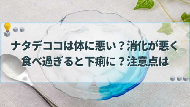 料理・食材 ナタデココは体に悪い?消化が悪く食べ過ぎると下痢に?注意点は ナタデココは体に悪い食べ物ではありませんが、食べ過ぎると食物繊維が原因で消化不良になり、腹痛や下痢を引き起こすおそれがあります。この記事ではナタデココの特性や、一緒に摂って欲しい食品などをご紹介していきます。 料理・食材