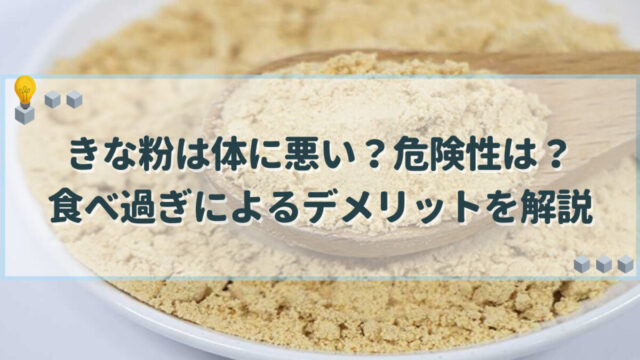 料理・食材 きな粉は体に悪い?危険性は?食べ過ぎによるデメリットを解説 きな粉を食べ過ぎると体に悪いと言われているのは、豊富に含まれる食物繊維やほかの食べ物との組み合わせにより、腹痛や肥満の原因となる場合があるためです。この記事ではきな粉の栄養成分がもたらす健康面へのメリットやデメリットについて解説していきます。 料理・食材