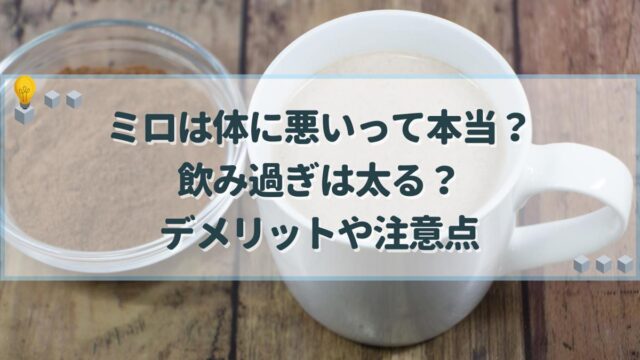 料理・食材 ミロは体に悪いって本当?飲み過ぎは太る?デメリットや注意点 ミロは体に悪いとされる理由は糖質が多めで太ることや、牛乳で飲む下痢になりやすいからですが、飲み過ぎなければ大丈夫ですし、添加物も問題ありません。この記事では、ミロのデメリットとなる糖質や、おすすめの飲み方などを紹介します。 料理・食材