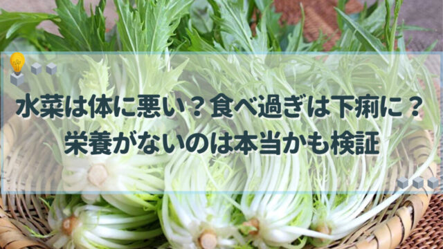 料理・食材 水菜は体に悪い?食べ過ぎは下痢に?栄養がないのは本当かも検証 水菜が体に悪いと言われるのは、食べ過ぎると冷えや食物繊維の摂り過ぎから下痢を起こしたり、付着細菌により食中毒を起こしたりする危険性があるためです。悪影響を避け、水菜を安心して効果的に食べるための適量や調理法を紹介します。 料理・食材