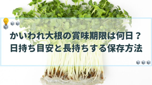 料理・食材 かいわれ大根の賞味期限は何日?日持ち目安と長持ちする保存方法 かいわれ大根の賞味期限は約3日間ですが、正しく保存すれば1週間ほど日持ちします。黒い点が葉に現れても食べられますが、カビの発生には注意してください。この記事では、鮮度の良い状態や正しい保存方法について紹介します。 料理・食材