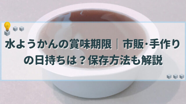 料理・食材 水ようかんの賞味期限|市販・手作りの日持ちは?保存方法も解説 水ようかんは市販品の賞味期限にばらつきがありますが長い物が多いです。開封後は手作りと同様に日持ちしません。この記事では長持ちしない理由や食中毒について、水ようかんと羊羹の異なる保存方法を紹介しています。 料理・食材