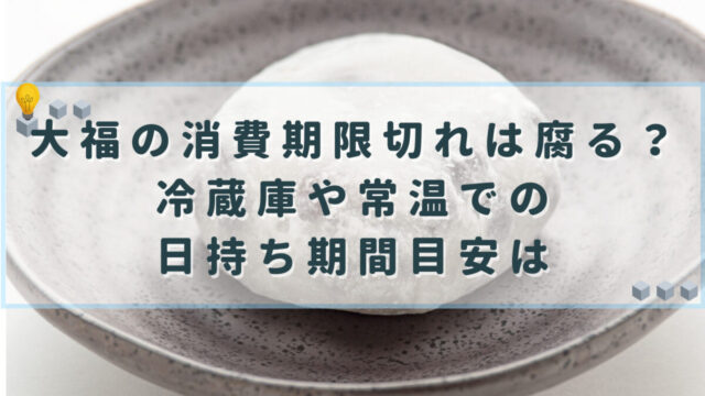 料理・食材 大福の消費期限切れは腐る?冷蔵庫や常温での日持ち期間目安は 大福は日持ちが短く、消費期限切れになる前に食べることをおすすめします。高温多湿な時期の常温保存は避け、冷蔵庫で一時保管し、食べきれない場合は腐る前に冷凍しましょう。解凍後におすすめのアレンジレシピも紹介しています。 料理・食材