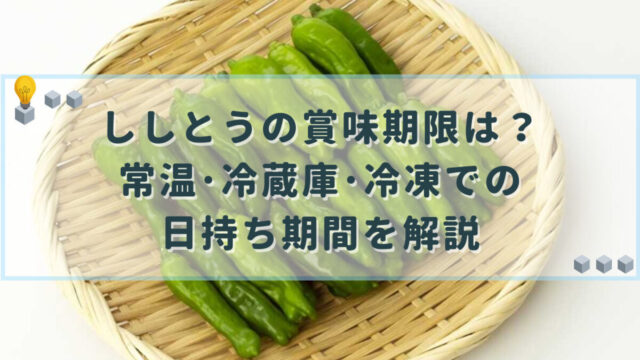 料理・食材 ししとうの賞味期限は?常温・冷蔵庫・冷凍での日持ち期間を解説 ししとうの賞味期限は常温だと2~3日ほどと短いため、手に入ったらすぐに冷蔵庫に入れましょう。食べ切れない場合は、冷凍保存もできますよ。その他にも、ちょっとしたコツで長持ちさせる方法や作り置きレシピも紹介するので、ぜひチェックしてくださいね。 料理・食材