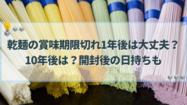料理・食材 乾麺の賞味期限切れ1年後は大丈夫?10年後は?開封後の日持ちも 乾麺は賞味期限切れになっても、商品と保存状態次第では1年程度食べられる可能性があります。しかし開封後はダニやカビが発生しやすく、未開封でも品質が劣化する恐れがあります。乾麺を安全に食べるために日持ち期間の目安やリスク・保存方法を解説します。 料理・食材