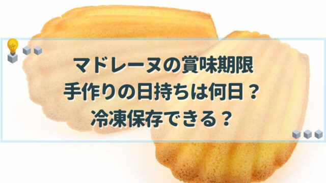 料理・食材 マドレーヌの賞味期限|手作りの日持ちは何日?冷凍保存できる? 手作りマドレーヌは市販品のように賞味期限が決まっていません。常温だと数日しか日持ちしませんが、冷凍保存することでより長く保存ができます。この記事ではマドレーヌの賞味期限や正しい保存方法などを紹介します。 料理・食材