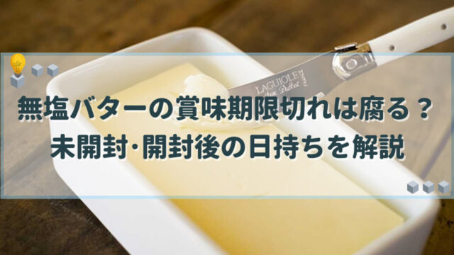 料理・食材 無塩バターの賞味期限切れは腐る?未開封・開封後の日持ちを解説 賞味期限切れの無塩バターは未開封で冷蔵庫で保存していれば、多少の期間食べられる可能性があります。ただし、開封後は早めに食べきりましょう。誤った保存方法だと期限内でも腐る恐れがあるので、正しい保存方法で管理しましょうね。 料理・食材
