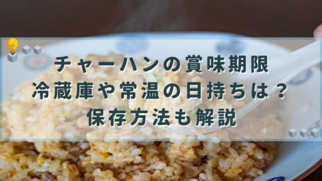 料理・食材 チャーハンの賞味期限|冷蔵庫や常温の日持ちは?保存方法も解説 チャーハンは具材から出る水分で細菌が繁殖しやすく賞味期限は短いため、早めに食べきりましょう。常温で放置した場合は食中毒の危険があり、冷蔵で長く保存すると味が落ちるため、作り置きの保存は冷凍がおすすめです。 料理・食材