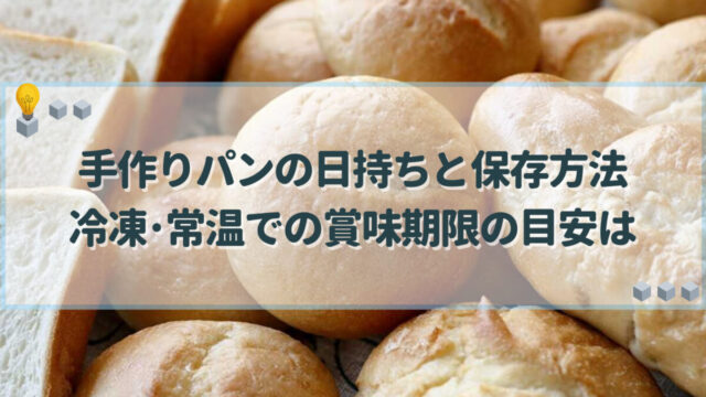 料理・食材 手作りパンの日持ちと保存方法|冷凍・常温での賞味期限の目安は 手作りパンは常温保存だと日持ちしないので、長持ちさせたい場合は冷凍保存しましょう。中には冷凍に不向きなパンもあるので確認しておくと安心です。この記事では食パンをはじめとする手作りパンの正しい保存方法や冷凍時のコツを紹介しています。 料理・食材