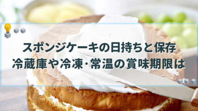 料理・食材 スポンジケーキの日持ちと保存|冷蔵庫や冷凍・常温の賞味期限は スポンジケーキは常温保存で日持ち期間は2日程度ですが、冷凍すれば賞味期限は2~3週間と長くなります。冷蔵庫に入れると固くなりますが、正しい保存方法を覚えればスポンジケーキのふわふさの美味しさをキープできるようになります。 料理・食材
