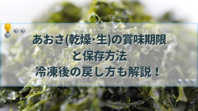 料理・食材 あおさ(乾燥・生)の賞味期限と保存方法|冷凍後の戻し方も解説! あおさの賞味期限は乾燥タイプなら常温で3ヶ月以上保存できるものが多いですが、変色や劣化を防ぐには冷蔵庫保存がおすすめです。生あおさも冷凍すれば長く保存し、料理に使いやすくできます。あおさの風味を堪能できるよう、賞味期限の目安や鮮度を保つコツを覚えましょう。 料理・食材