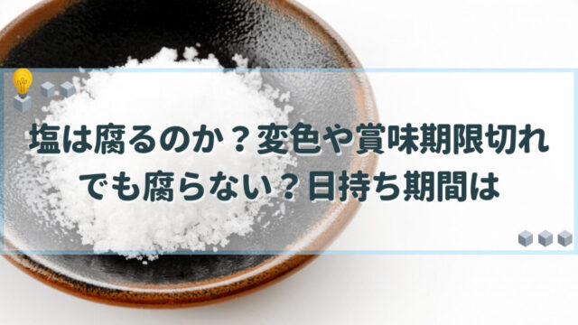 料理・食材 塩は腐るのか?変色や賞味期限切れでも腐らない?日持ち期間は 【野菜ソムリエプロ監修】塩はその特性から基本的に腐ることはないので、賞味期限の有無に関わらず長持ちします。この記事では、塩が腐らない理由や古くて固まった塩の対処法、サラサラをキープする保存方法を紹介しているので、参考にしてくださいね。 料理・食材