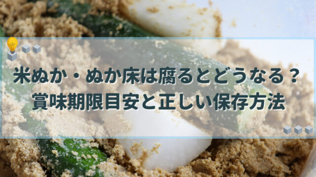 料理・食材 米ぬか・ぬか床は腐るとどうなる?賞味期限目安と正しい保存方法 米ぬかやぬか床は腐るとカビが生えたり腐敗臭が消えなくなるなどの特徴が現れるので、それらのポイントを確認すれば食べられるかの判断ができます。米ぬか・ぬか床の正しい保存方法や賞味期限のほか、古くなった米ぬかの活用方法もご紹介します。 料理・食材