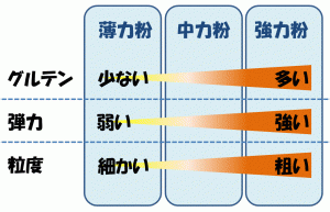小麦粉に含まれているタンパク質の比重が少ないとグルテン量が少なく、タンパク質量が多いとグルテン量も多くなるのですが、グルテンが少ない方から順に薄力粉→中力粉→強力粉となります。