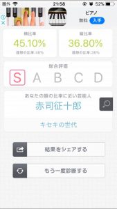 横比率、縦比率、総合評価が5段階(SABCD)、あなたの顔の比率に近い芸能人が表示されます。