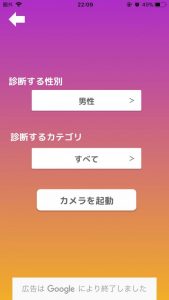 【診断する性別】、【診断するカテゴリ】を選択し、【カメラを起動】をタップします