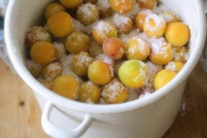 4.ボールに梅を入れて、焼酎を振りかけます。これは、カビ発生の予防と殺菌のためです。次に別のボールに梅を移して、今度は塩をひとつかみとって梅にまぶします。