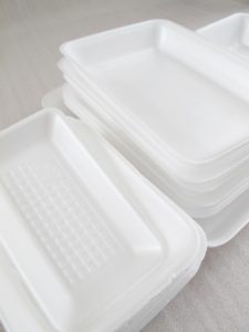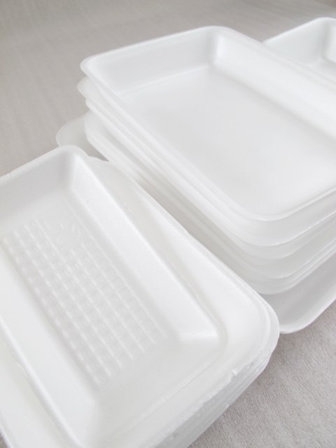 身近なものだと、スーパーなどで肉や魚が入っているトレイも発泡スチロールの一種です。