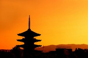 阿闍梨餅を食べながら産寧坂を下っていくと、石造りの大きな鳥居が見えてきます。