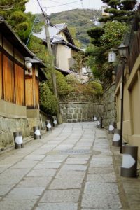 石の鳥居をくぐらずに、まっすぐ進めば『ねねの道』と呼ばれる石畳の路地に入ります。さらに少し歩くと東に、豊臣秀吉の妻、寧々が晩年を過ごした高台寺があります。