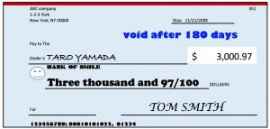 しかし、もし、「void after 180 days」と書かれていれば、その小切手は振出し日から、180日間、つまり、3ヶ月が期限です。