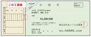 「線引小切手」または別名「横線小切手(おうせんこぎって)」は、小切手の表の上部に二重線があるのが特徴です。