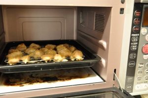 4. 3をトレーに乗せて、800Wで約5分加熱し、その後20分間オーブントースターの中に入れたまま予熱調理します。