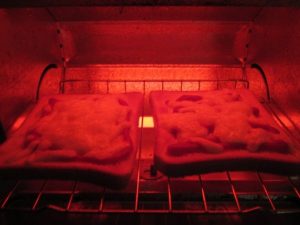 オーブントースターは、庫内の上下もしくは上か下どちらかに付けられたヒーターが発熱して赤外線を出すとともに温度が高くなります。