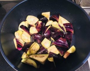 ナスの果肉はアクが強く空気に触れるすぐに色が変わってしまうので切ったらすぐに水にさらしましょう。
