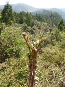 山に自生しているタラの木は、白っぽく幹や枝の表面に鋭いとげがあります。