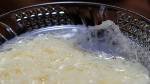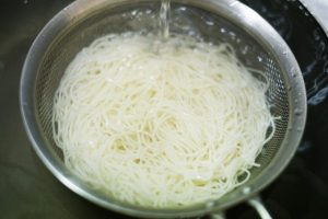 このレシピは簡単で、少し硬めに茹でたそうめんを、冷水でキリっとしめます。