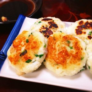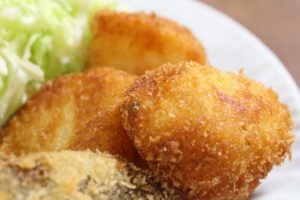 - はんぺんをつぶして玉ねぎと混ぜ、成型してコロッケにする