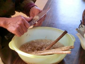 酢水につけることで、酸化を防いで、ごぼうを白く保つことができます。