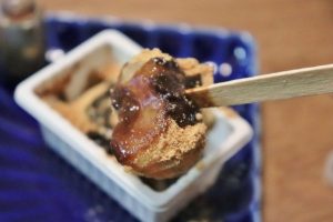 - 餅、きな粉、黒蜜が混ざり合ったら、キレイに食べられます!