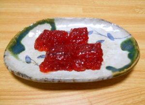 • 明太子:たらこを唐辛子の入った調味料に漬け込んだもの