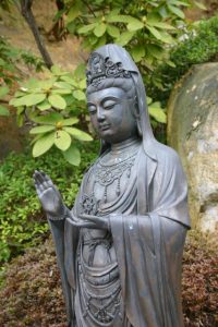 観音堂の御本尊瑠璃観世音菩薩で、お堂の正面には中国の観音聖地・普陀山より請来された瑠璃観世音菩薩石像があり、百八観音霊場のお砂踏みができます。