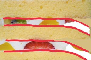 赤線のように断面が曲がる理由は、スポンジがクリームやフルーツの水分を吸って膨張するからです。