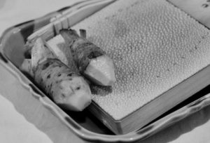 - 生わさびをグラスに入れて、頭が出るくらいに水を入れる