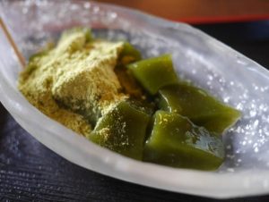 抹茶わらび餅など、抹茶を入れて綺麗な色をつけているタイプもあります。