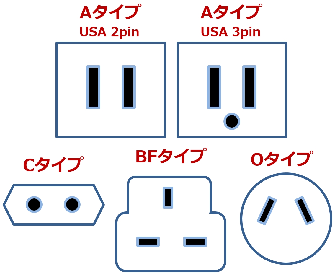 コンセント形状 A, C, BF, Oタイプ