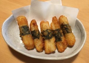 すりおろした山芋にざく切りにしたキムチと顆粒だしを混ぜ合わせ、海苔で巻いて揚げます。