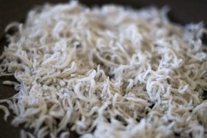 - フライパンにごま油をひき、たくあんとちりめんじゃこ(ひとつかみ)を炒める