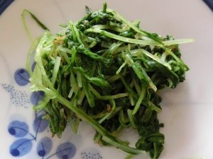 - 洗ってカットした水菜1束を湯に入れ、ごま油(大さじ2/3)を加える