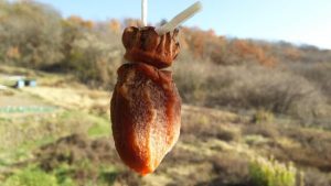 干し柿を干し続けると、乾燥が進みます。水分が抜けて固くなっていくので、お好みの固さになったら乾燥を止めましょう